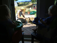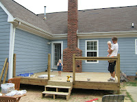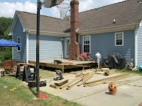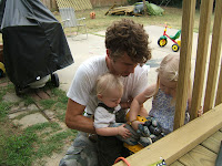 Here are a few pictures. Josh, just rebuilt our deck last week. the first picture is the only one I could find of our old deck, the rotten wood wasn’t very fun to play on. Pic. 2 is Josh tearing up the deck while the kids ate lunch, pic. 3 is Josh and Geoffrey, pic. 4 is the railing getting up, pic. 5 are Josh and his “helpers”, the next two are the finished product. Pretty sweet if you ask me!